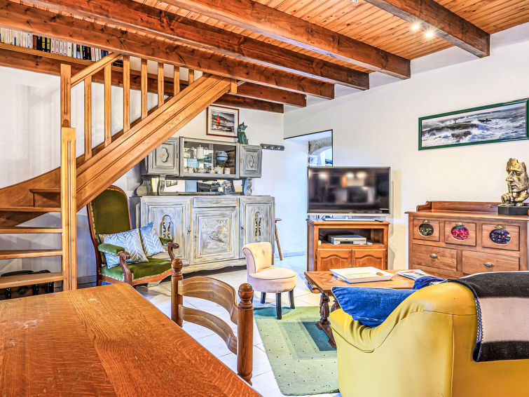 "Maison de Kerguen", 3-Zimmer-Haus 65 m2. Komfortabel eingerichtet: Wohn-/Esszimmer mit TV (Flachbildschirm). Küche (Backofen, 4 Flammen, Toaster, Wasserkocher, Mikrowelle, elektrische Kaffeemaschine, Kapseln für die Kaffeemaschine (Dolce Gusto) extra, Racletteofen). Dusche, sep. WC. E-Heizung. Obergeschoss: 1 Zimmer mit 2 Betten (90 cm, Länge 190 cm). 1 Zimmer mit 1 franz. Bett (1 x 140 cm, Länge 190 cm). Kleine Terrasse, Garten 400 m2. Terrassenmöbel, Gartengrill. Zur Verfügung: Waschmaschine, Bügeleisen, Haartrockner. Maximal 1 kleines Haustier/Hund erlaubt. Inserat einer Privatperson nach Artikel 155, IV, CGI.