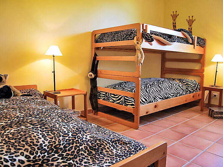 5-Zimmer-Haus 120 m2 auf 2 Stockwerken. Eingang. Wohn-/Esszimmer 36 m2 mit offenem Kamin und TV (Flachbildschirm), Stereoanlage. Ausgang zur Terrasse. 1 Zimmer mit 1 franz. Bett. Küche (4 Kochplatten, Backofen, Geschirrspüler, Mikrowelle, Tiefkühler, elektrische Kaffeemaschine). Dusche, sep. WC. Obergeschoss: 1 Zimmer mit 1 Doppelbett (140 cm, Länge 190 cm). 1 Zimmer mit 2 Betten (80 cm, Länge 190 cm). 1 Zimmer mit 1 Bett (80 cm, Länge 190 cm), 1 x 2 Etagenbetten (80 cm, Länge 190 cm). Bad, sep. WC. Terrassenmöbel. Zur Verfügung: Waschmaschine, Wäschetrockner, Kinderhochstuhl, Babybett. Internet (WLAN). Garage auf dem Grundstück (1 Auto). Bitte beachten: Rauchmelder, Feuerlöscher.