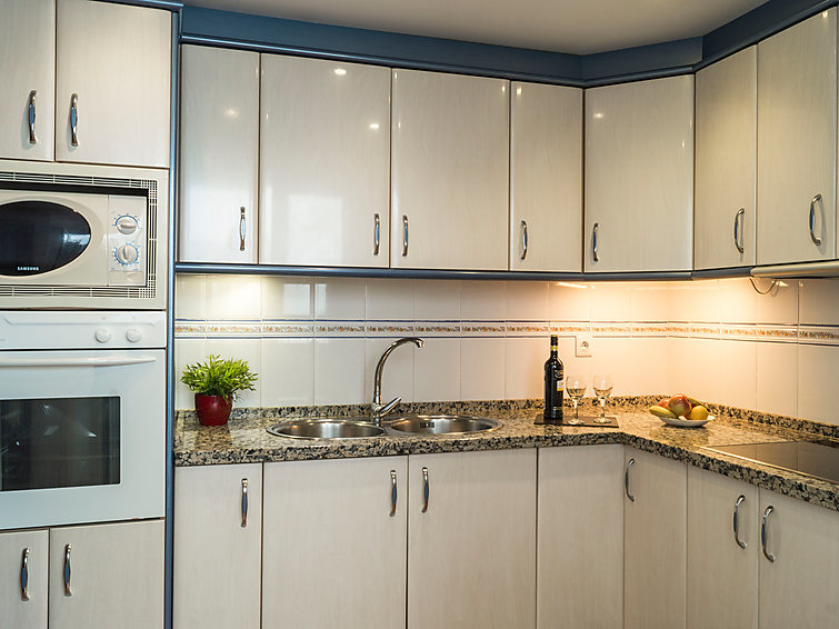 Appartement 3-kamers 80 m2 op de 4e verdieping. Eenvoudig en doelmatig ingericht: woon-/eetkamer 20 m2 met TV, air-conditioning en heteluchtverwarming. 1 kamer met 1 2-pers bed en ventilator. 1 kamer met 2 bedden (90 cm), ventilator. Keuken (4-pits kookplaat, oven, magnetron, diepvriezer). Bad/WC, aparte WC. Elektrische verwarming. Terras 13 m2, op het oosten gelegen en op het zuiden gelegen. Terrasmeubelen. Uitzicht op zee, het zwembad en de tuin. Ter beschikking: wasmachine, kinderbed. Internet (WiFi, gratis). Garage nr. -3 Nº10. VUT/MA/12585 // Reg. Nr.: ESFCTU0000290290007850020000000000000000VUT/MA/125852